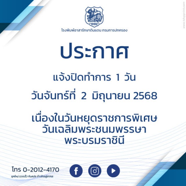 ประกาศแจ้งหยุดทำการ 1 วัน ในวันจันทร์ที่ 2 มิถุนายน 2568 เนื่องในวันหยุดราชการพิเศษ วันเฉลิมพระชนมพรรษา พรรบรมราชินี
