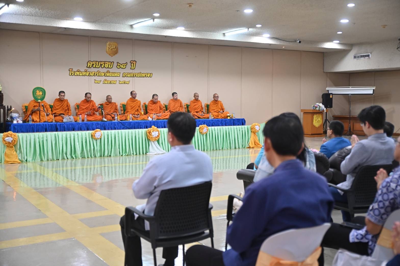 วันที่ 25 กันยายน 2568 เวลา 09.09 น. ณ โรงพิมพ์อาสารักษาดินแดน คลอง 9 อำเภอลำลูกกา จังหวัดปทุมธานี นายนิรัตน์ พงษ์สิทธิถาวร อธิบดีกรมการปกครอง และประธานคณะกรรมการดำเนินงานโรงพิมพ์อาสารักษาดินแดน เป็นประธานในพิธีทำบุญเนื่องในโอกาสครบรอบ 68 ปี พร้อมด้วยคณะผู้บริหาร ข้าราชการ และพนักงานในสังกัดกรมการปกครอง รวมทั้งเจ้าหน้าที่โรงพิมพ์ฯ เข้าร่วมอย่างพร้อมเพรียง จากนั้นมอบเกียรติบัตรแก่พนักงานเกษียณอายุราชการ จำนวน 4 ท่าน เพื่อเป็นการเชิดชูเกียรติและแสดงความขอบคุณในความทุ่มเทตลอดระยะเวลาการทำงาน บรรยากาศเต็มไปด้วยความอบอุ่นและความภาคภูมิใจ สะท้อนถึงความร่วมแรงร่วมใจของครอบครัว “โรงพิมพ์อาสารักษาดินแดน” ที่ยืนหยัดเคียงคู่กรมการปกครองมากว่า 6 ทศวรรษ และพร้อมก้าวสู่ปีที่ 69 อย่างมั่นคงและยั่งยืน