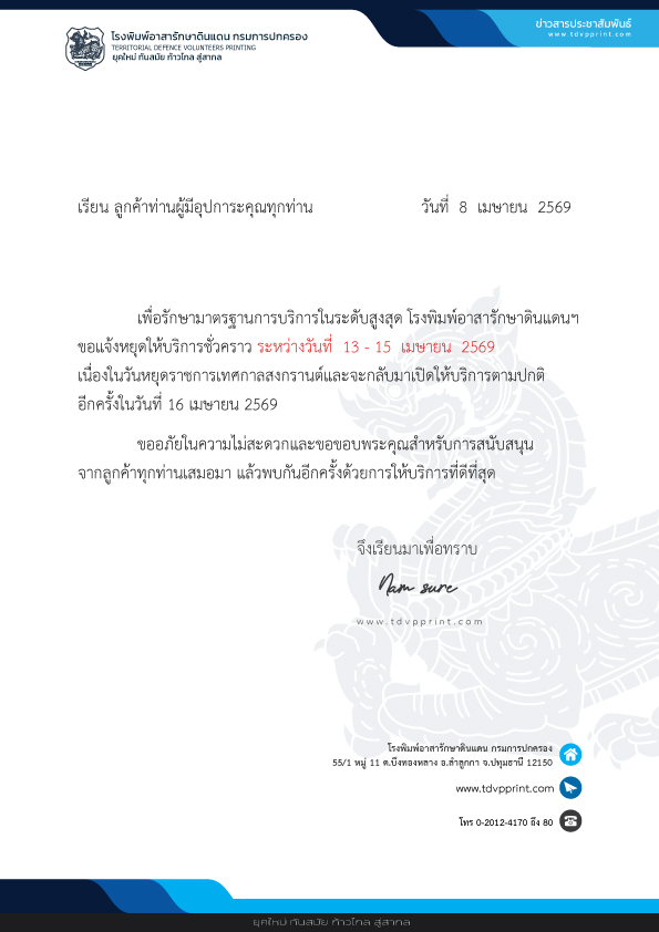 ประกาศแจ้งหยุดทำการ 3 วัน ระหว่างวันที่ 13-15 เมษายน 2569 เนื่องในวันหยุดเทศกาลสงกรานต์