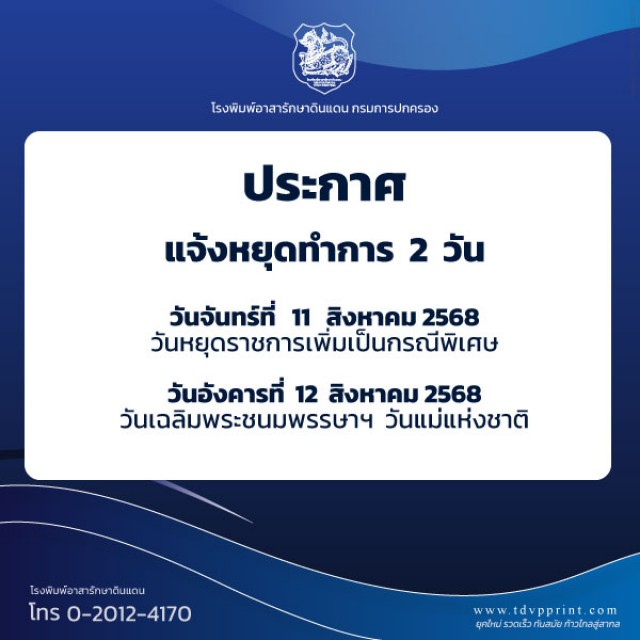 ประกาศแจ้งหยุดทำการ 1 วัน ในศุกร์ที่ 3 ตุลาคม 2568 เนื่องในวันสัมมนาโรงพิมพ์อาสาฯ