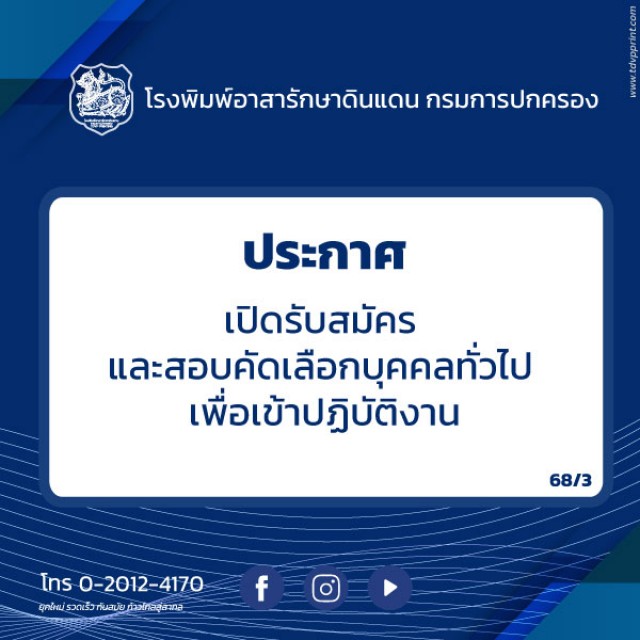 ประกาศ-เปิดรับสมัครและสอบคัดเลือกบุคคลทั่วไป เพื่อบรรจุเป็นพนักงาน โรงพิมพ์อาสารักษาดินแดน กรมการปกครอง 68/3
