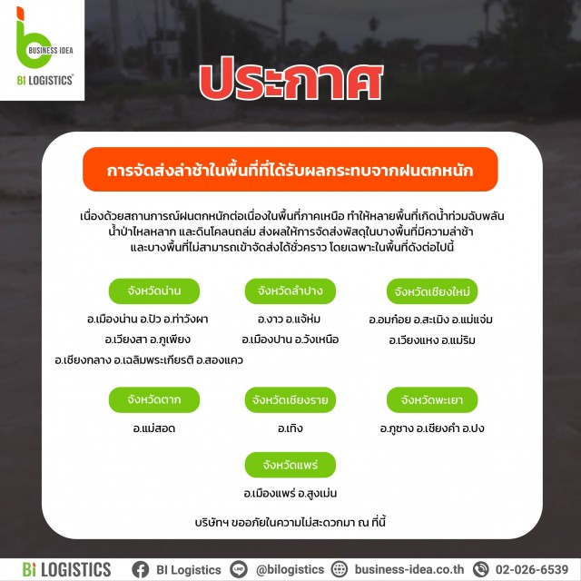 แจ้งระยะเวลาขนส่งล่าช้าจากปกติ เนื่องจากสถานการณ์ฝนตกหนักน้ำท่วมในหลายพื้นที่ทางภาคเหนือ