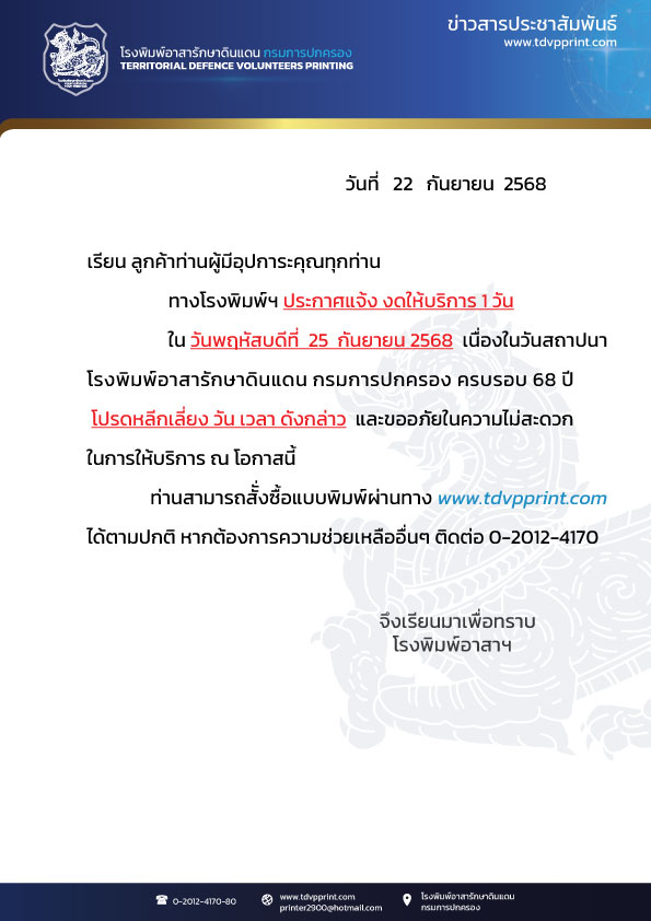 ประกาศแจ้ง-งดให้บริการ 1 วัน ในวันพฤหัสบดีที่ 25 กันยายน 2568 เนื่องในวันสถาปนาโรงพิมพ์อาสาฯ