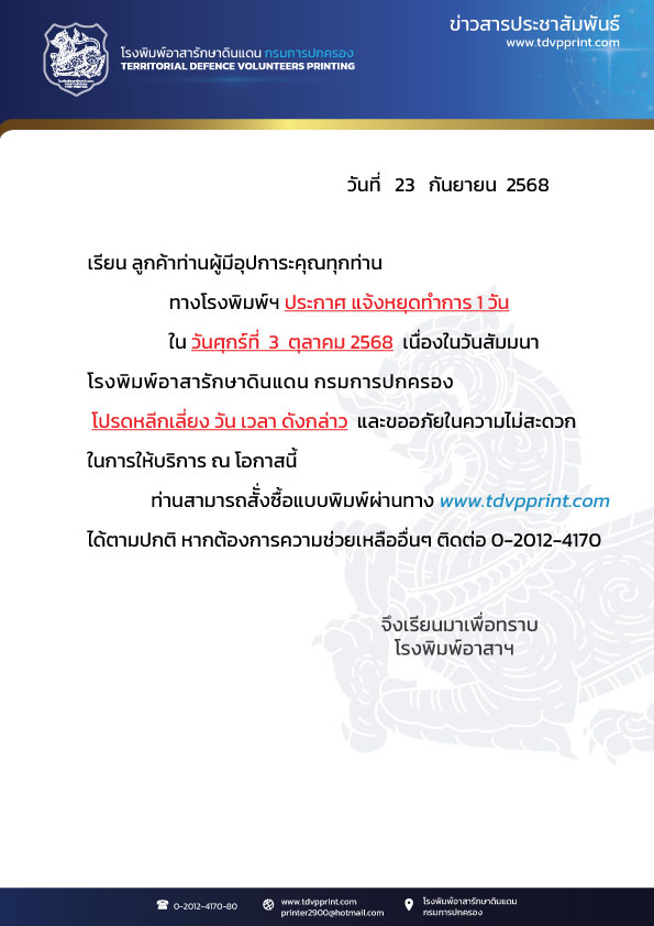 ประกาศแจ้งหยุดทำการ 1 วัน ในศุกร์ที่ 3 ตุลาคม 2568 เนื่องในวันสัมมนาโรงพิมพ์อาสาฯ