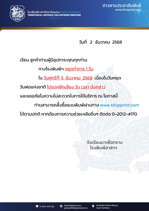 ประกาศแจ้งหยุดทำการ 1 วัน ในวันศุกร์ที่ 5 ธันวาคม 2568 เนื่องในวันคล้ายวันพระราชสมภพ ร.9 และวันพ่อแห่งชาติ