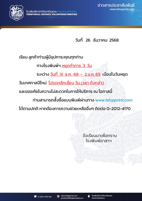 ประกาศแจ้งหยุดทำการ 3 วัน ในวันที่ 31 ธันวาคม 2568 - 2 มกราคม 2569 เนื่องในวันหยุดเทศกาลปีใหม่