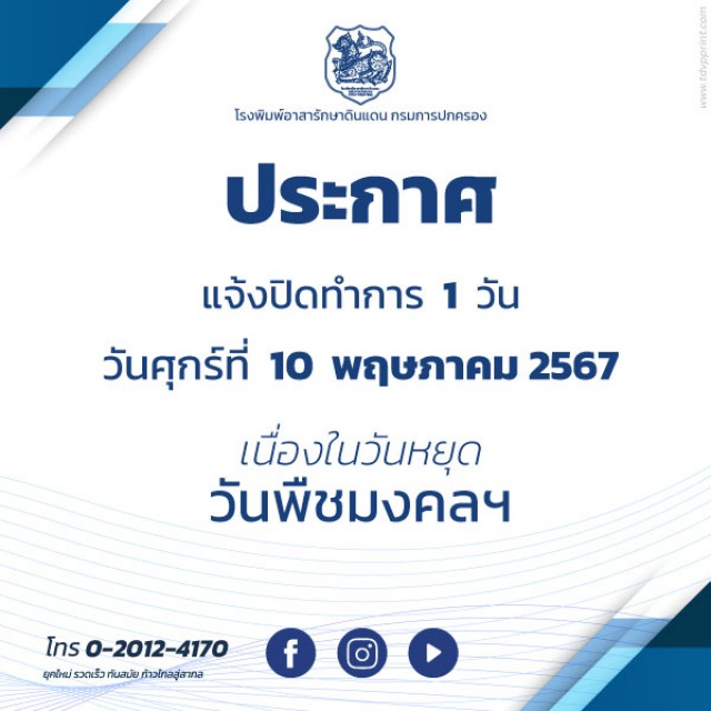 ประกาศแจ้งหยุดทำการ 1 วัน ในวันจันทร์ที่ 5 พฤษภาคม 2568 เนื่องในวันหยุดชดเชยวันฉัตรมงคล