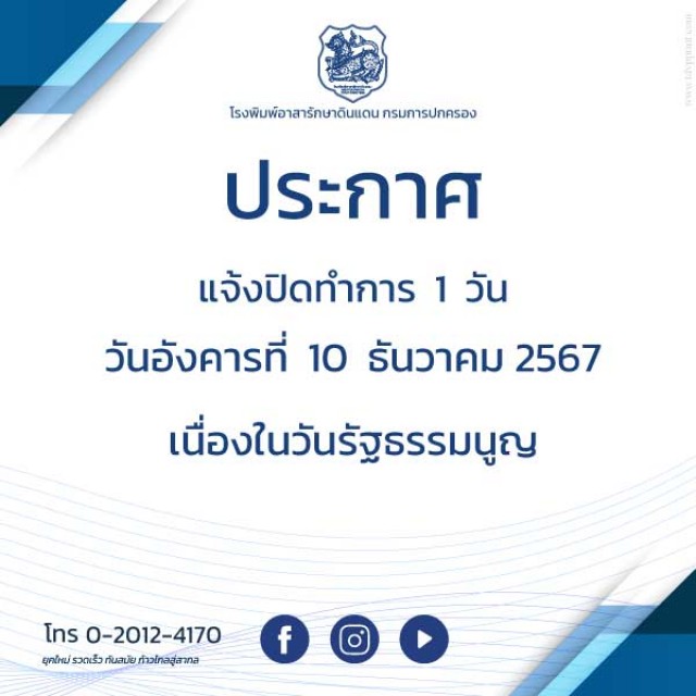 ประกาศแจ้งหยุดทำการ 1 วัน ในวันพุธที่ 10 ธันวาคม 2568 เนื่องในวันพระราชทานรัฐธรรมนูญ